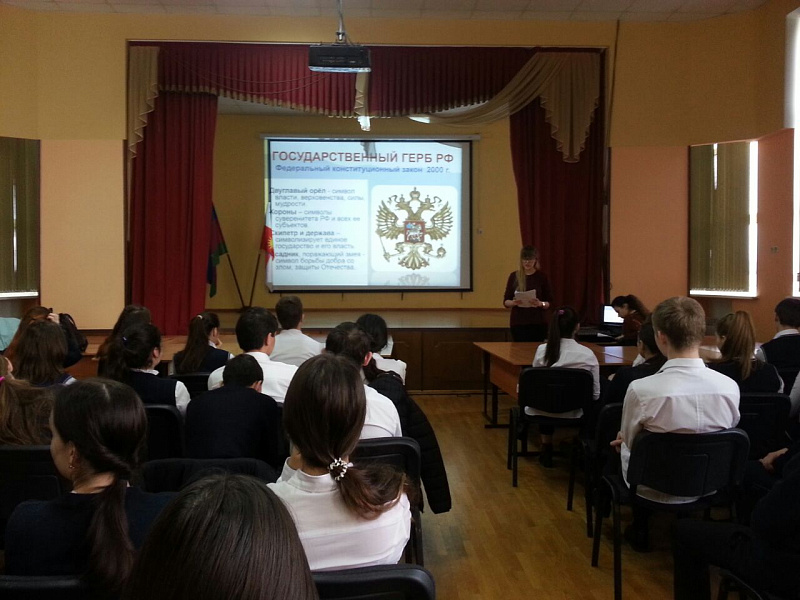 Данное мероприятие проходило в виде открытого урока, с использованием мультимедийной презентации «Конституция Российской Федерации - основной закон страны».