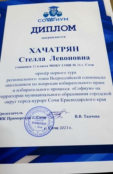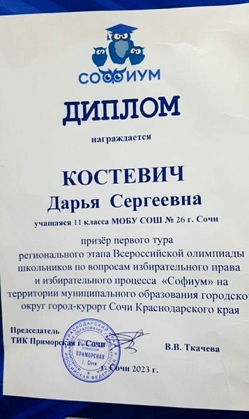 Сегодня состоялось награждение победителей и призёров первого тура регионального этапа Всероссийской олимпиады школьников по вопросам избирательного права и избирательного процесса "Софиум". Поздравляем учащихся 11 "А" класса и их педагога, Кучерову Ирину Игоревна, с заслуженными наградами.